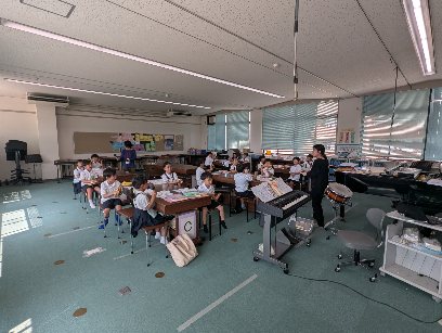 音楽の授業の様子です。「ぶんぶんぶん」の歌に合わせて、いろいろな打楽器をリズムよくたたいていました。歌声も大きく、打楽器に負けていませんでした。友達と交換しながら、いろいろな楽器を使っていました。