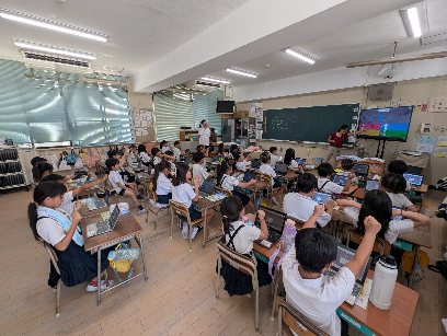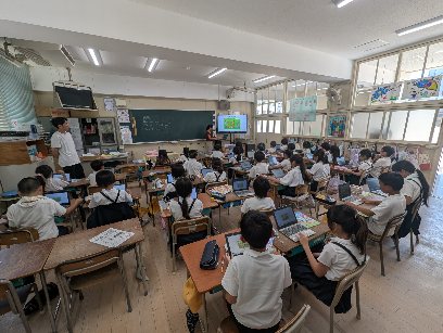 外国語活動の授業の様子です。C-NETの授業を受けていました。カフートを使って、4択クイズをしていました。英語を聞き取ってクイズに答えていました。正解すると大きな歓声が上がっていました。