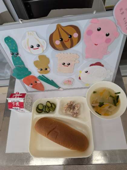 今日のメニューは、鶏肉のからあげ・きゅうりのピリ辛あえ・ハムと冬瓜の中華スープ・黒糖パン・牛乳です。