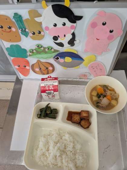 今日の献立は、みそ肉じゃが・あつあげのしょうがじょうゆかけ・オクラのおかかいため・ごはん・牛乳です。