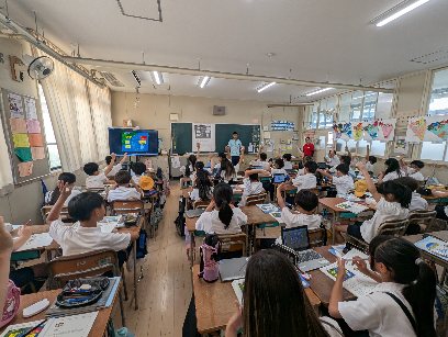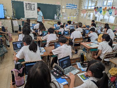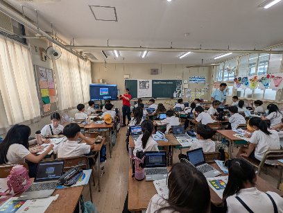 理科の授業研究会の様子です。先生たちが見守る中、台風の学習を発展させて防災について考えていました。台風から身を守るためには、どうすればよいかについて、4年生で学習した自助・共助・公助から考えていました。