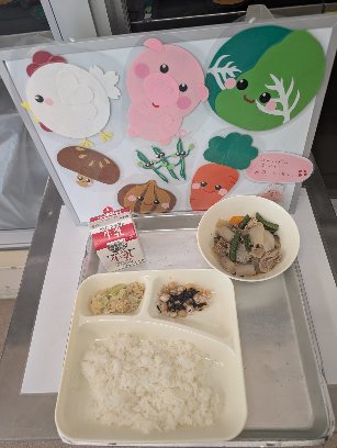 今日の献立は、豚肉と野菜の煮もの・ひじきまめ・ささみとキャベツのごまみそ焼き・ごはん・牛乳です。