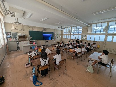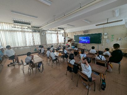 お楽しみ会をしていました。みんなで動画を視聴していました。学期末のひと時を、みんなで楽しく過ごしていました。