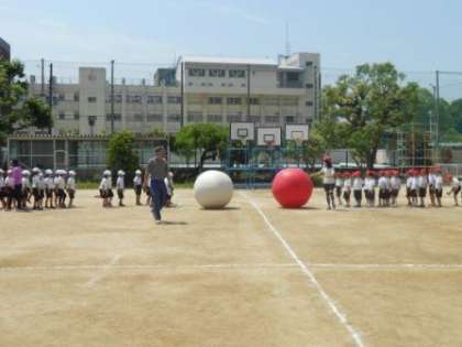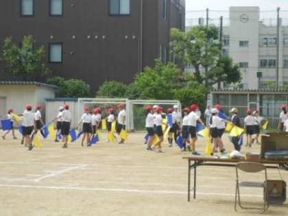 5・6年生は両手にフラッグを持ち、団体演技を行います。全体が統一された動き、フラッグのなびく音に高学年の力強さを感じます。来賓・地域・PTA・学年競技の「大玉おくり」の練習もしました。練習でしたが、赤白競り合っていました。本番が楽しみです。皆様、ご参加ください!
