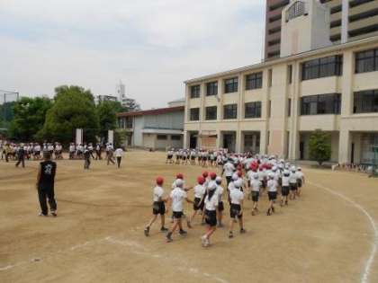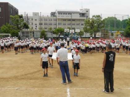 本日のフリータイムは、全校児童が入場行進と校歌・運動会の歌の練習を行いました。昨日から、夏のような日差しが照りつけ、1学期に練習しているとは思えない暑さの中、子どもたちは一生懸命練習に取り組んでいました。入場行進では、本部席前で国旗、校旗を持つ角度を変えたり、学年のプラカードの向きを変えたりと細かい工夫もしてくれています。