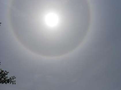 フリータイムに、子どもたちから「虹が出てる」と教えてもらいました。空を見上げると、太陽のまわりに虹がかかっているように見えました。太陽のまわりにできる輪を「暈(かさ)」といいます。空中の氷晶によって太陽の光が回折・散乱されて現れる気象現象のようです。暈がかかると雨が降るかもしれないといわれます。しかし、今日は降りませんでした。