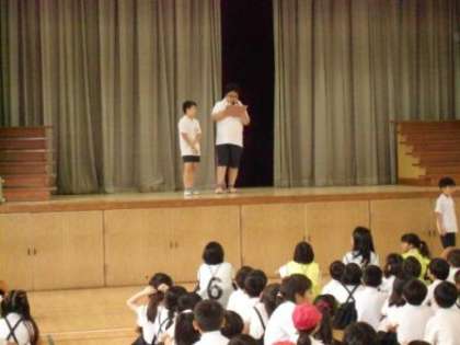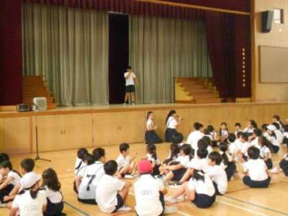 6月14日(火)児童集会を行いました。舞台のカーテンの間を横切った物を当てるゲームをしました。なかなか難しく、何かを当てるのがとても難しかったです。ランドセルやざるなど、工夫されていました。
