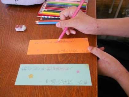9月21日(水)フリータイムに敬老会を予定しています。地域の高齢者の方をご招待し、子どもたちが作った手作りのしおりを贈らせていただきます。しおりを作成している様子です。子どもたちも心をこめて作っています。