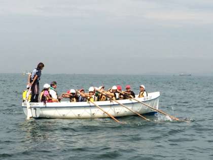 みんなでカイの動きを合わせて大阪湾に出て行きます。波を越えていきます。
