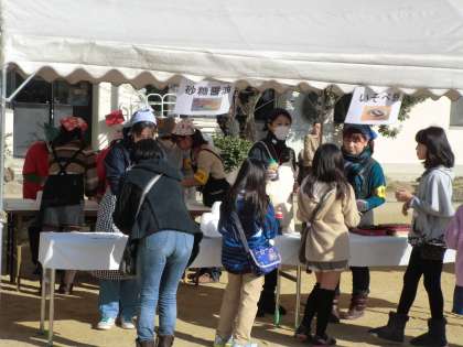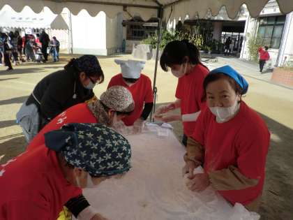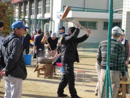 12月8日(日)に中道小学校の校庭で、地域のもちつき大会が行われました。もちをつき、丸めて、きな粉や大根おろしにつけたり、ぜんざいにして地域の人たちにふるまわれました。