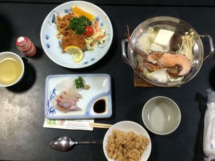 子どもたちが大喜びの夕食です。伊勢エビがプリプリでした!炊き込みご飯、カンパチの刺身も最高でした!
