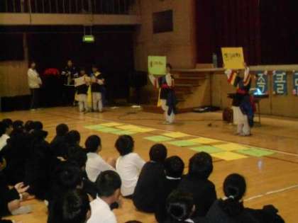 や楽器の紹介をしたり、民族クラブの児童が民族文化祭で発表したサムルノリを披露したりしました。最後には全校児童が一緒にゲームをして盛り上がりました。