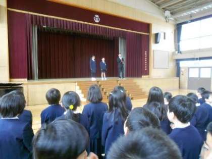 4月10日(月) 少し長い春休みが終わり、平成29年度1学期が始まりました。始業式の前に、着任式を行いました。昨年度末に7名の教職員の方が転任され、本年度は6名の教職員の方をお迎えしました。始業式では、転入生の2名を紹介し、子どもたちは担任の先生も決まり、やる気に満ち溢れた表情をしていました。最後に、1年生との対面式を行い、6学年、182名の子どもたちが講堂に揃いました。中道小学校の子どもたちがキラキラ輝く1年でありますように!