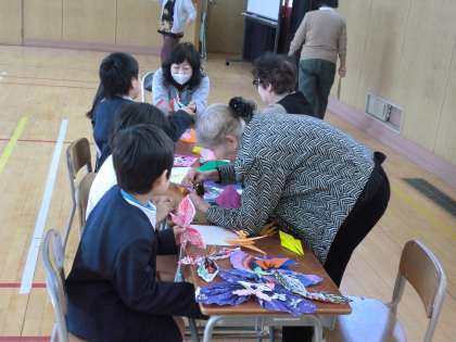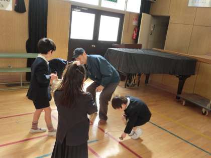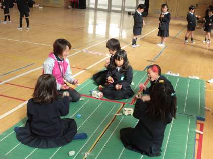 2月13日(木)の3・4時間目に1・2年生がせいかつ科の学習の一環として「昔遊び」をしました。地域の長寿会の方々に来ていただき、昔の遊びを教えてもらい、一緒に楽しい時を過ごすことができました。
