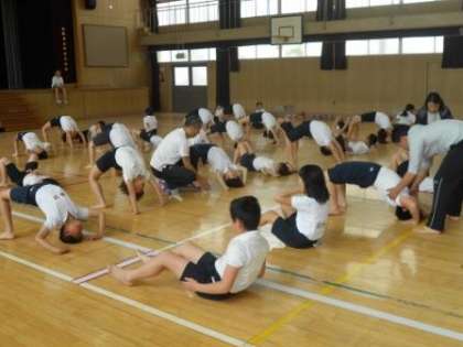 2時間目は5・6年生が団体演技の練習をしました。今年は組体操の演技も取り入れた構成の団体演技です。一人技を初めて練習しました。
