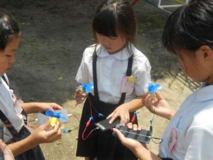 7月6日(木) 4年生の理科は光電地を使って実験していました。今日は晴れていましたので、条件がよく、羽根がしっかり回転する様子を見ることができました。