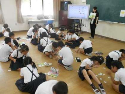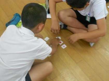 5年生の様子です。ジェスチャーを交えて、カードをとるゲームをしていました。先生の英語をちゃんと聞き取って、カードをとっていました。