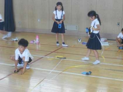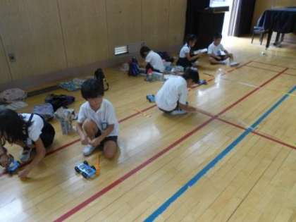 7月12日(水) 2時間目、3年生は体育館で理科の学習をしました。ゴムの力で車を走らせる実験をしていました。車が走った距離や速さなどを観察し、ゴムのはたらきを学習していました。