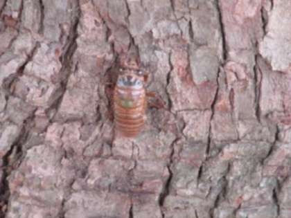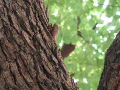 学習園でセミの幼虫が土の中から出てきた様子を先生が見つけてくれました。夕方、地上に現れたセミの幼虫がクスノキに登りはじめ、羽化を始めました。日没前に見ることができた珍しい様子でした。写真で紹介します。