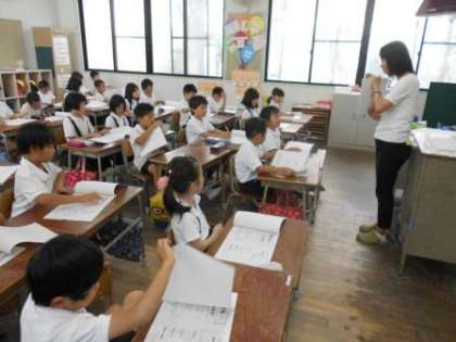 教室では、通知票をもらったり、夏休みの課題の説明を聞いたりしていました。