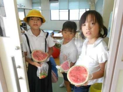 学習園でスイカを収穫しました。実が赤くて甘そうなスイカができました!