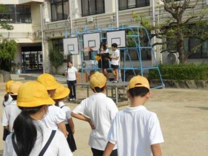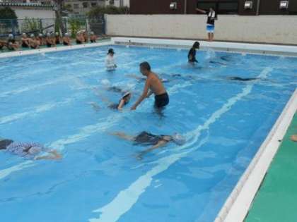 児童朝会と高学年の水泳学習の様子です。高学年は泳力が高くなっています。