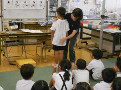 昨日に引き続き、発育測定時に、1年生の保健指導がありました。1年生には、背骨の役割や、頭の重さ、正しい姿勢保持の大切さを、模型や手作りのTシャツを使って、わかりやすく指導してもらいました。