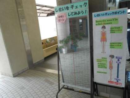 玄関に姿勢を確認するコーナーを保健室の山本先生に設置していただきました。とてもわかりやすく、子どもたちも、自然に確認しています。ご家庭でも姿勢について話題にしていただけるとありがたいです。