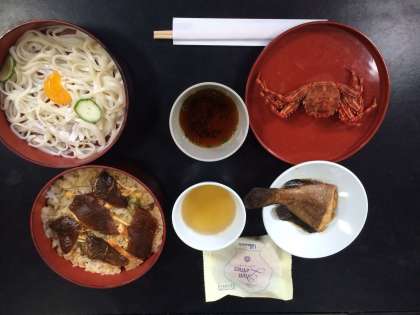 本日の昼食です。伊勢うどん、手こね寿司、魚の煮付け、茹でカニという豪華な昼食でした。子どもたちが釣り上げた魚を宿舎の方に煮付けにしていただきました。