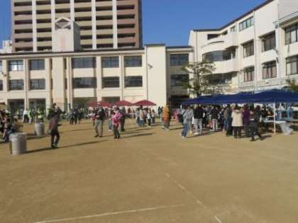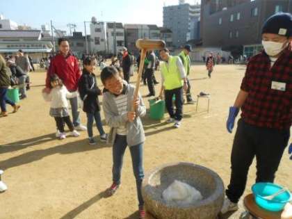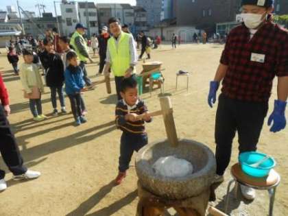 中道小学校の子どもたちや地域の子どもたちもおもちをつかせてもらうことができました。