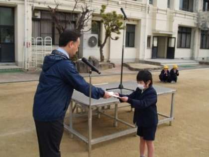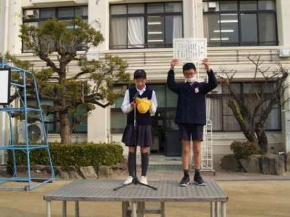 2月19日(月) 児童朝会で、2年生児童が作ったエコ俳句の表彰状を披露しました。また、中道小学校に「大阪市学校よい歯の表彰」の表彰状をいただきましたので、健康委員会の児童が披露してくれました。