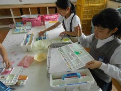 4年生は図工室で絵の具を使い、学習していました。5年生は運動場で体育、6年生は教室で算数の学習に取り組んでいました。
