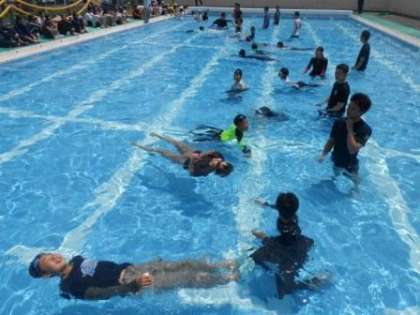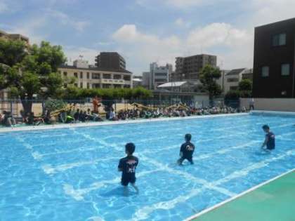 7月11日(水) 3・4時間目は5年生、6年生が着衣泳の学習を行いました。水着の上から衣服・靴を身に付け、学習に取り組みます。今年は、東成消防署員の皆様に指導を依頼させていただきました。レスキュー隊員の皆さんは日ごろから訓練されており、万一の時、命を守る手段を教えていただきました。今回はペットボトルやバケツを活用して、体を浮かし、救助を待つ方法を教えていただきました。子どもたちにとって、貴重な経験になりました。東成消防署員の皆様、ありがとうございました。