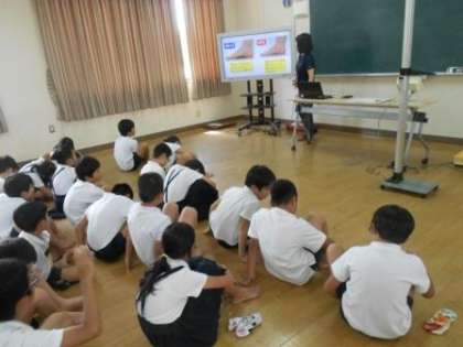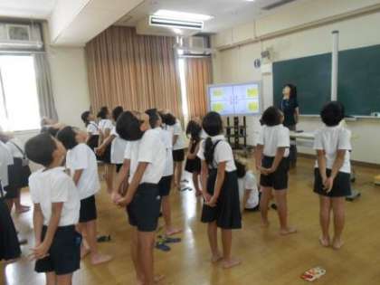 8月29日(水) 4年生の保健指導の様子です。山本先生から全学年の子どもたちは、健康な足の形や良い姿勢を保つストレッチを教えていただいてます。「キャットレッチ」は行いやすいので、教室でもご家庭でもすぐにできます。お子様のお話をきいてあげてください。