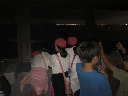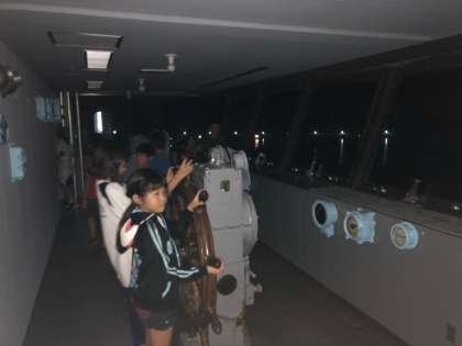 研修棟の操舵室に入りました。夜なので明かりはありませんが、かすかな明かりをたよりに、夜景を眺めていました。