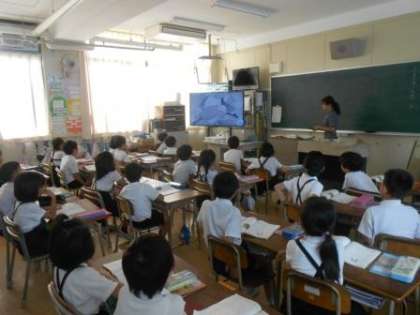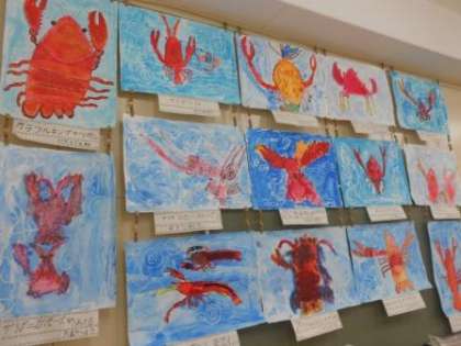 9月18日(火) 2年生は、電子黒板を活用し、国語のデジタル教科書を使って授業を行っていました。教室には子どもたちが飼育していたザリガニの絵が掲示してあります。