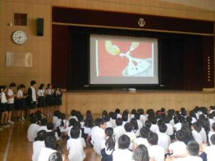 10月5日(金) 児童集会では、図書委員会の発表を行いました。プロジェクターを使って、本の紹介をわかりやすく行うことができました。
