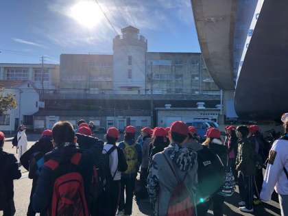 写真の建物は菅島小学校です。菅島小学校の児童数は20名ほどと聞き、みんな驚いていました。