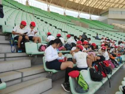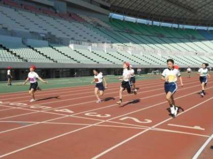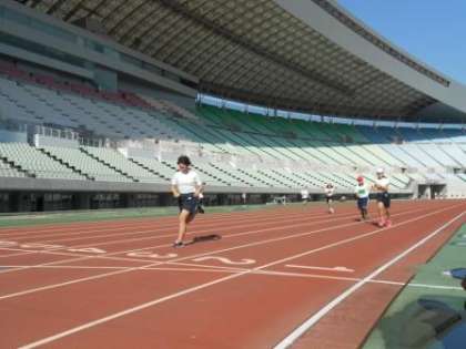 午前中は100М走を行いました。子どもたちは、国際大会で使用されるトラックで、100Мを走る貴重な経験をすることができました。