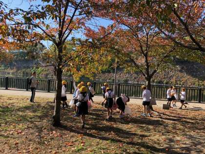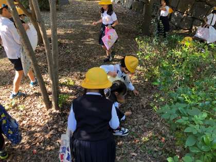 大阪城公園では、落ち葉やドングリを集めました。ドングリを見つけた時は一生懸命集めていました。