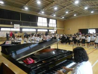 民族クラブ校内発表会で3択クイズ、「モリオッケ」の歌を歌っている様子です。