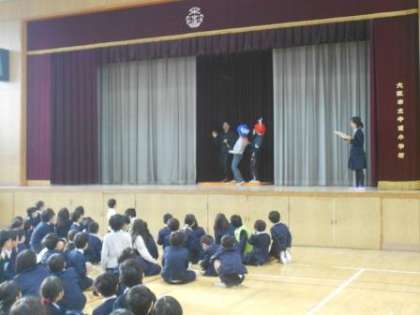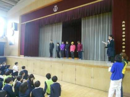 12月21日(金) 今日は2学期最後の児童集会でした。いつもは集会委員会の子どもたちが中心になって楽しいゲームをしてくれますが、今日は本校の職員が子どもたちが考えた集会のゲームにたくさん登場しました。みんな小道具をもったり、衣装をつけたりと、ふだん見れない職員の姿を見て、子どもたちは大喜びでした。