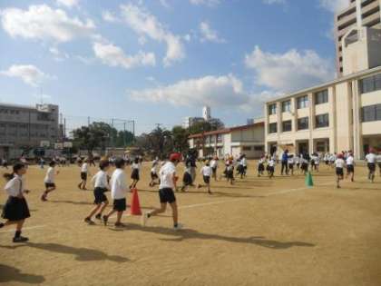寒い中、子どもたちはフリータイムのかけ足をがんばっています。