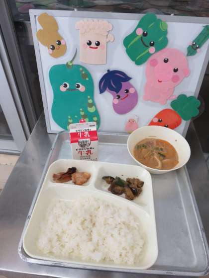 今日の献立は、鶏肉の照り焼き・とうがんのみそ汁・なすのそぼろいため・ごはん・牛乳です。