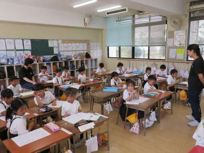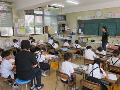 算数の授業の様子です。たし算の問題文を考えていました。算数では、計算を解くことだけでなく、問題を作る力も問われます。今回はたし算の問題を作っていました。みんなうまく作ることができるといいですね。