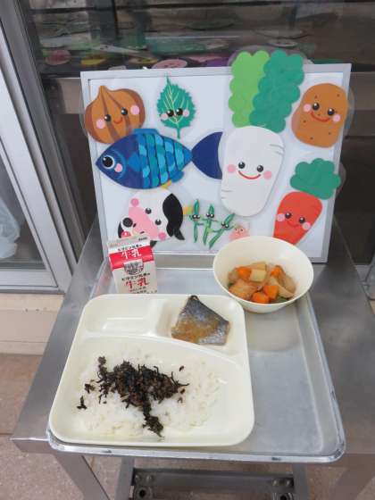 今日の献立は、さごしのおろしじょうゆかけ・含め煮・牛ひじきそぼろ・ごはん・牛乳です。