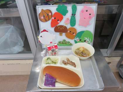 今日のメニューは、鶏肉のバジル焼き・ベーコンと野菜のスープ煮・キャベツときゅうりのサラダ・コッペパン・ブルーベリージャム・牛乳です。
