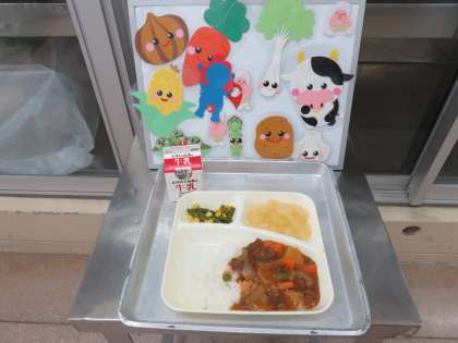 今日の献立は、ハヤシライス・洋なし(カット缶)・グリーンアスパラガスとコーンのサラダ・牛乳です。