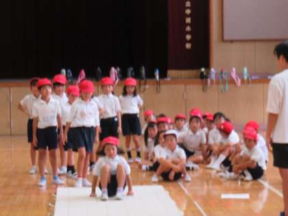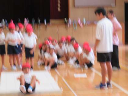 体育の授業の様子です。講堂でマットを使った運動をしていました。前回りをしていました。うまくなるためにはしっかり練習をしましょう。友達にアドバイスをしてもらうのは、上達への近道です。がんばりましょう。