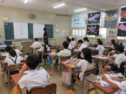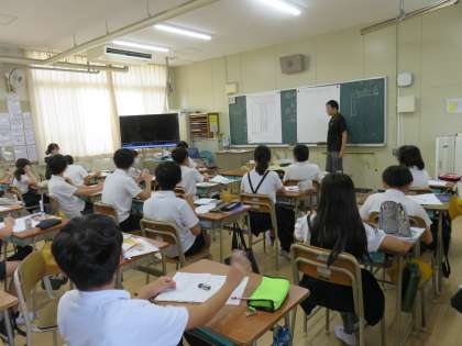 理科の授業の様子です。地層の学習をしていました。工事のときに採収した、小学校のボーリング試料を使って考えていました。身近なところにも学習の資料になるものがありますね。興味が深まったかな。